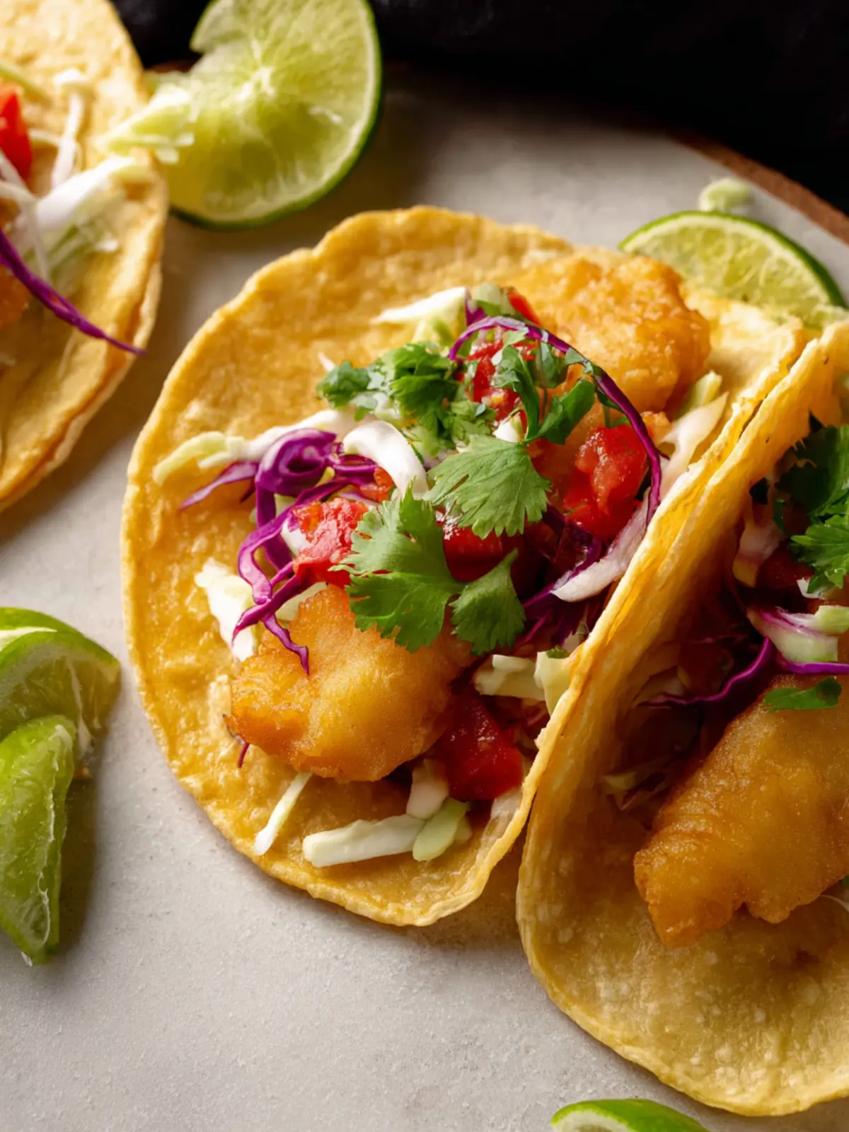 Enjoy these delicious beer-battered fish tacos topped with fresh cilantro and served with lime wedges.