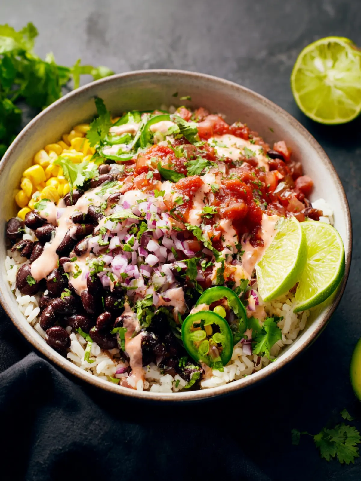 Toppings: Don’t forget a squeeze of lime juice and a dollop of Greek yogurt or sour cream to finish off your black bean burrito bowl with a zing.