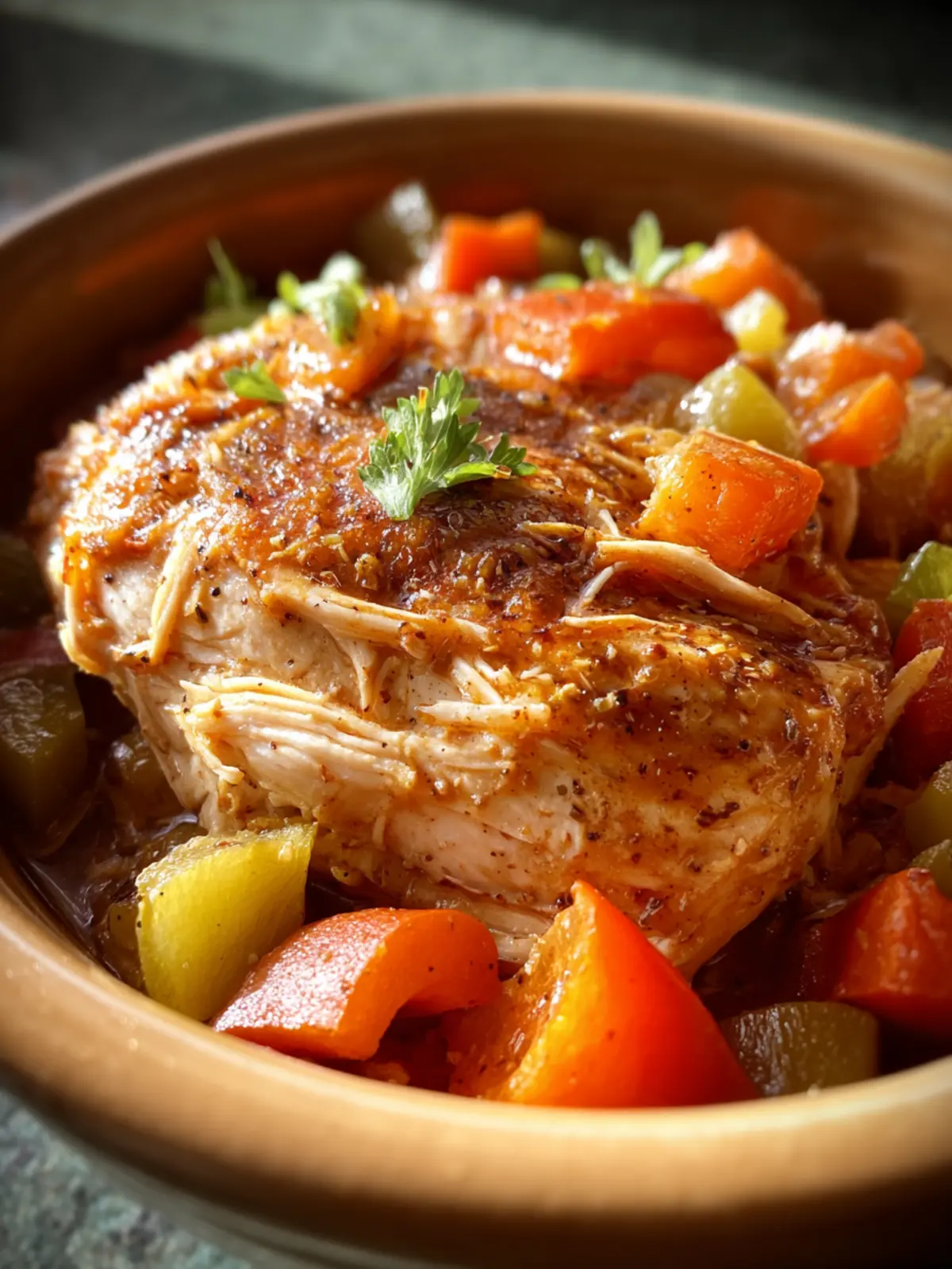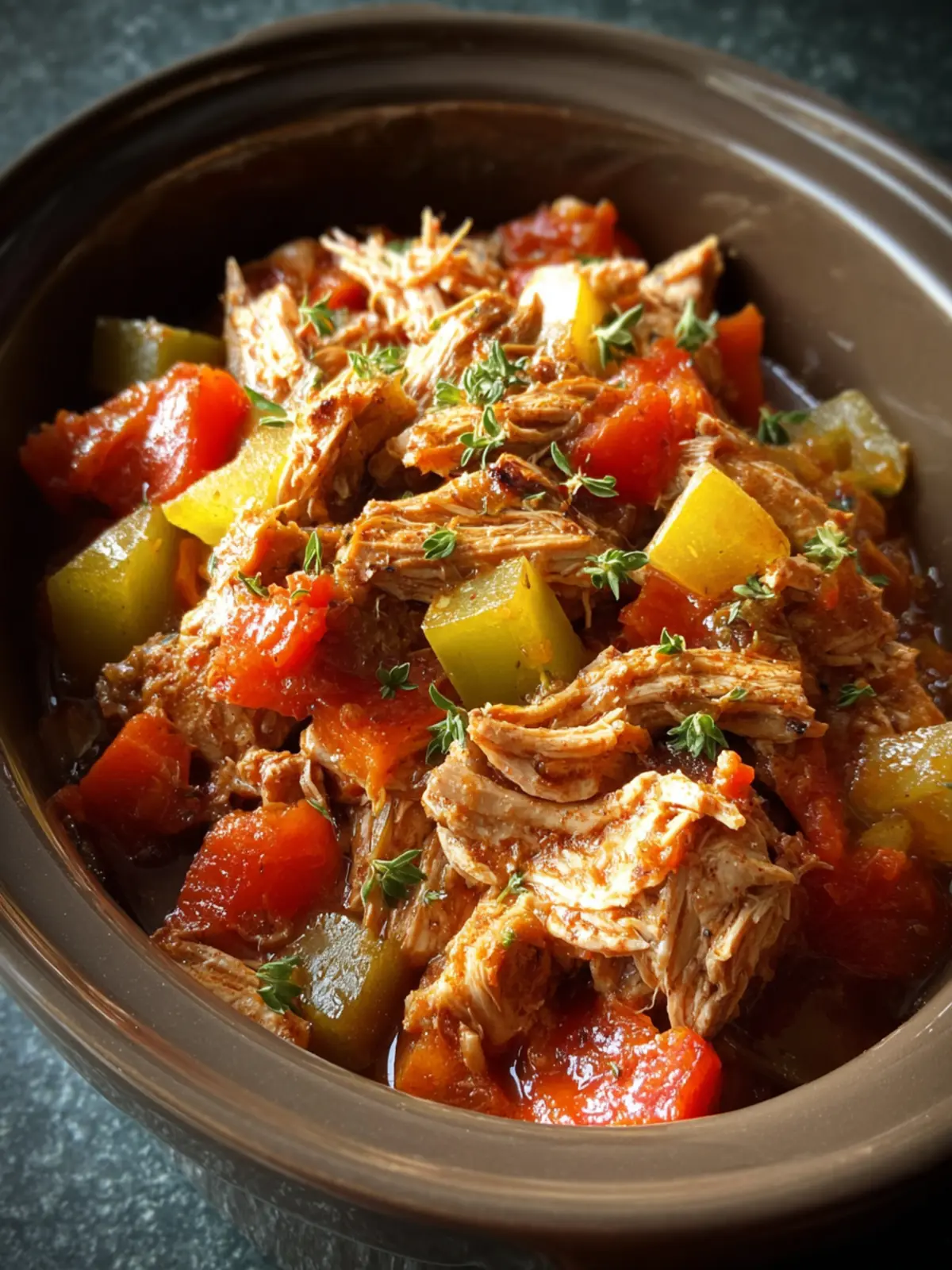 A simple and flavorful crockpot chicken recipe with tomatoes, bell peppers, and onions.