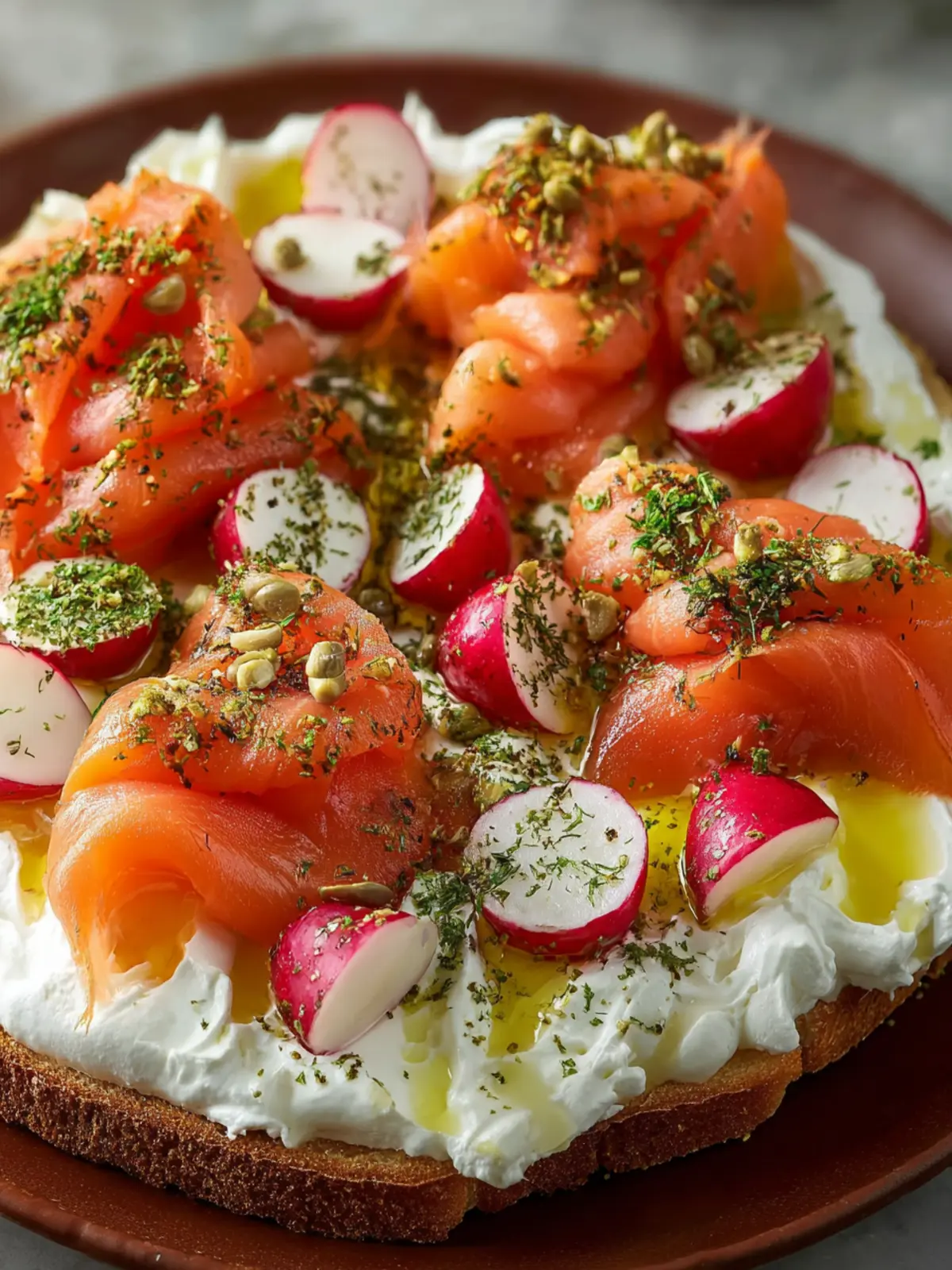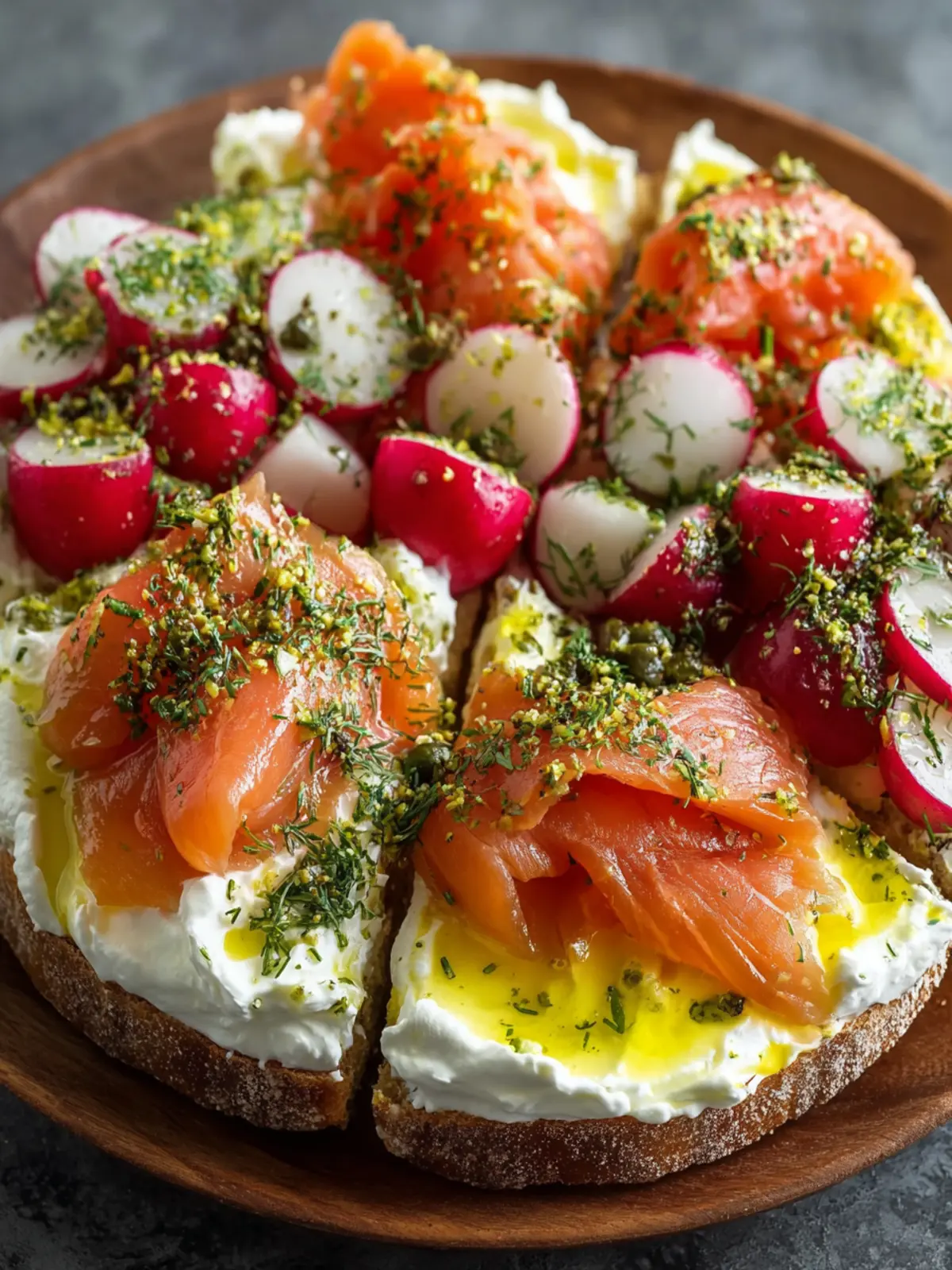Presentation: The vibrant colors of the ingredients make this dish not just delicious but visually appealing. Grouping the smoked salmon along the edges, nestling radishes in between, and generously dolling out labneh in the center creates a beautiful centerpiece that invites everyone to dig in.