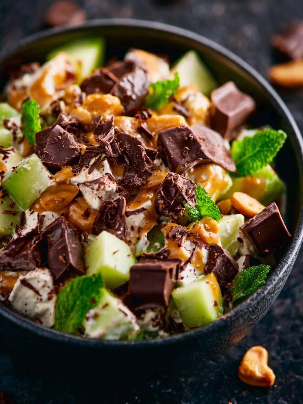 Texture Paradise: This salad boasts a variety of textures, from the crisp apples to the chewy Snickers and fluffy dressing, ensuring that each bite is an adventure.