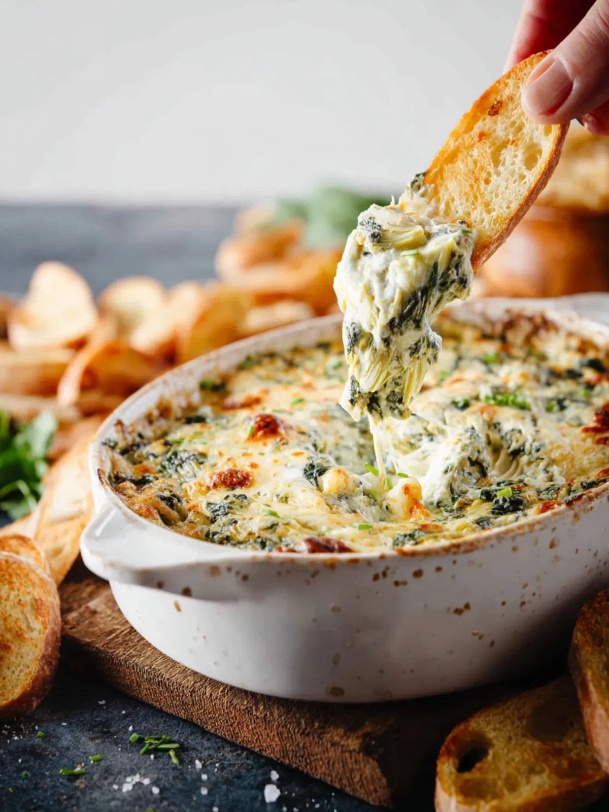 This spinach artichoke dip is versatile too. You can easily tweak it by adding spices or extra cheese according to your taste. Whether you prefer it mild or spicy, this dip caters to everyone’s palate, making it a guaranteed hit at any gathering. Get ready to fall in love with every cheesy, artichoke-filled bite!